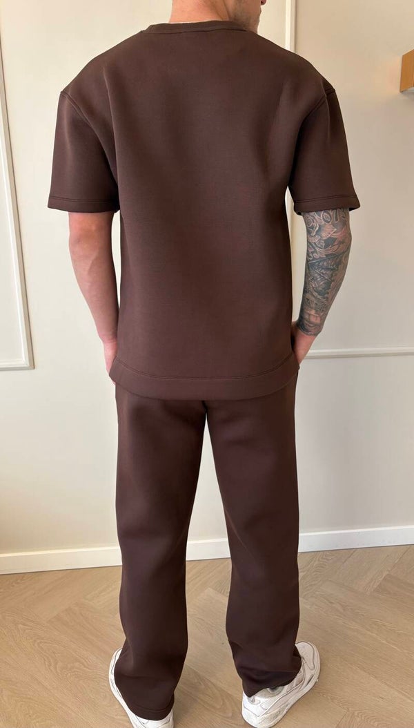 Set in een chocolade bruine kleur. Bestaat uit een comfortabel T-shirt met moderne fit en een rechte pantalon met subtiele naaddetails. Gemaakt van een stevige, zachte stof voor een luxe uitstraling en fijne pasvorm.